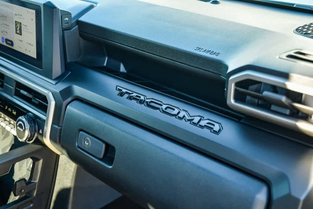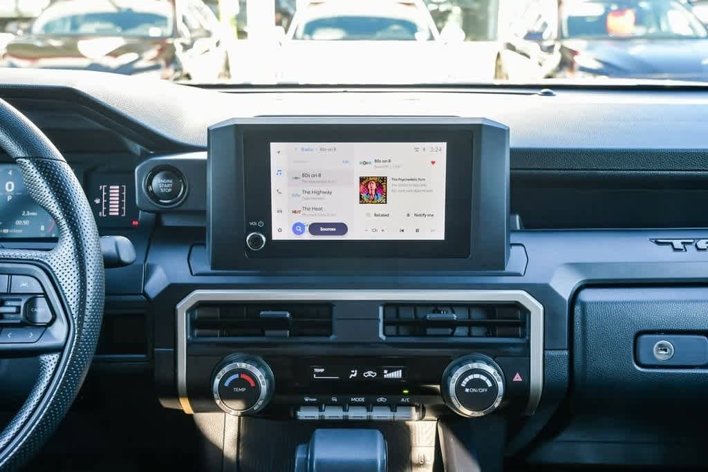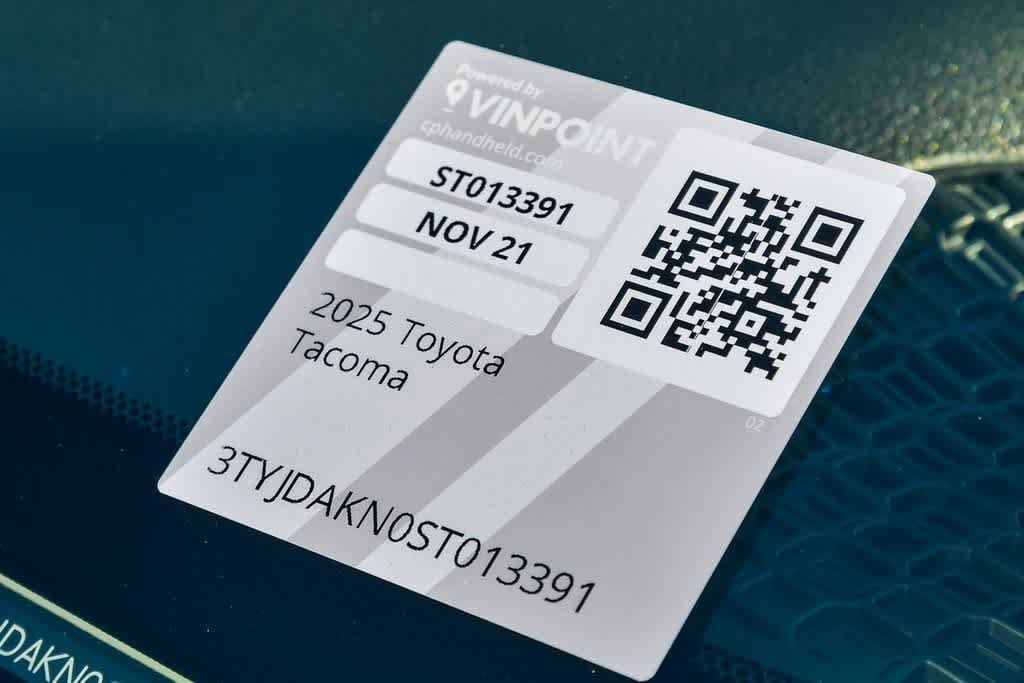 CARFAX One-Owner. Clean CARFAX. Certified. Ice Cap 2025 Toyota Tacoma SR 4WD 8-Speed Automatic 2.4L 4-Cylinder 17 Steel Wheels, 4 Speakers, 4-Wheel Disc Brakes, AM/FM radio: SiriusXM, Anti-whiplash front head restraints, Apple CarPlay/Android Auto, Auto High-beam Headlights, Brake assist, Bumpers: body-color, Driver door bin, Dual front impact airbags, Dual front side impact airbags, Electronic Stability Control, Emergency communication system: Safety Connect (1-year trial), Exterior Parking Camera Rear, Fabric Seat Trim, Front anti-roll bar, Front Bucket Seats, Front Center Armrest, Front reading lights, Front wheel independent suspension, Fully automatic headlights, Heated door mirrors, Illuminated entry, Knee airbag, Occupant sensing airbag, Outside temperature display, Overhead airbag, Overhead console, Passenger door bin, Power door mirrors, Radio: 8 Toyota Audio Multimedia, Rear step bumper, Remote keyless entry, Speed control, Speed-sensing steering, Steering wheel mounted audio controls, Telescoping steering wheel, Tilt steering wheel.