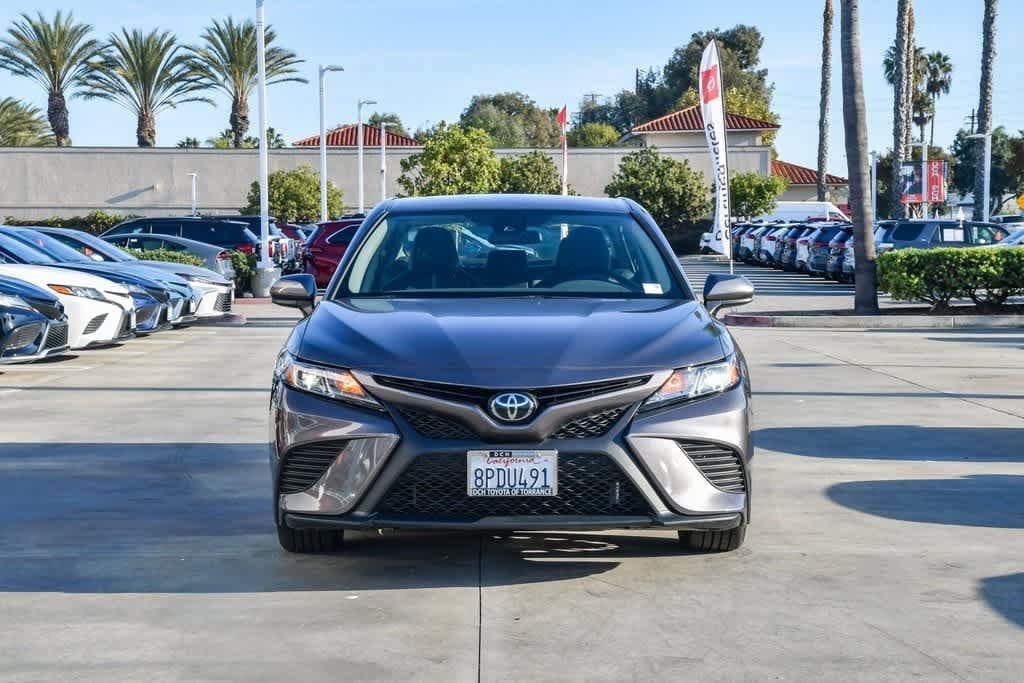 CARFAX One-Owner. Clean CARFAX. Predawn Gray Mica 2020 Toyota Camry SE FWD 8-Speed Automatic 2.5L I4 DOHC 16V 4-Wheel Disc Brakes, 6 Speakers, Air Conditioning, Alloy wheels, AM/FM radio: SiriusXM, Apple CarPlay/Android Auto, Automatic temperature control, Brake assist, Bumpers: body-color, Driver door bin, Driver vanity mirror, Dual front impact airbags, Dual front side impact airbags, Electronic Stability Control, Emergency communication system: Safety Connect with 1-year trial, Exterior Parking Camera Rear, Fabric Seat Trim w/SofTex, Four wheel independent suspension, Front anti-roll bar, Front Bucket Seats, Front Center Armrest, Front Sport Bucket Seats, Illuminated entry, Knee airbag, Occupant sensing airbag, Overhead airbag, Overhead console, Panic alarm, Passenger door bin, Passenger vanity mirror, Power door mirrors, Power driver seat, Radio data system, Radio: AM/FM Audio System, Rear anti-roll bar, Rear reading lights, Rear seat center armrest, Rear side impact airbag, Remote keyless entry, Security system, Speed control, Speed-sensing steering, Split folding rear seat, Spoiler, Sport steering wheel, Steering wheel mounted audio controls, Telescoping steering wheel, Tilt steering wheel, Wheels: 8.0J x 18 Black Machined-Finish Alloy.