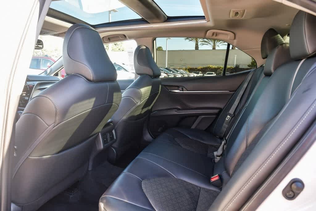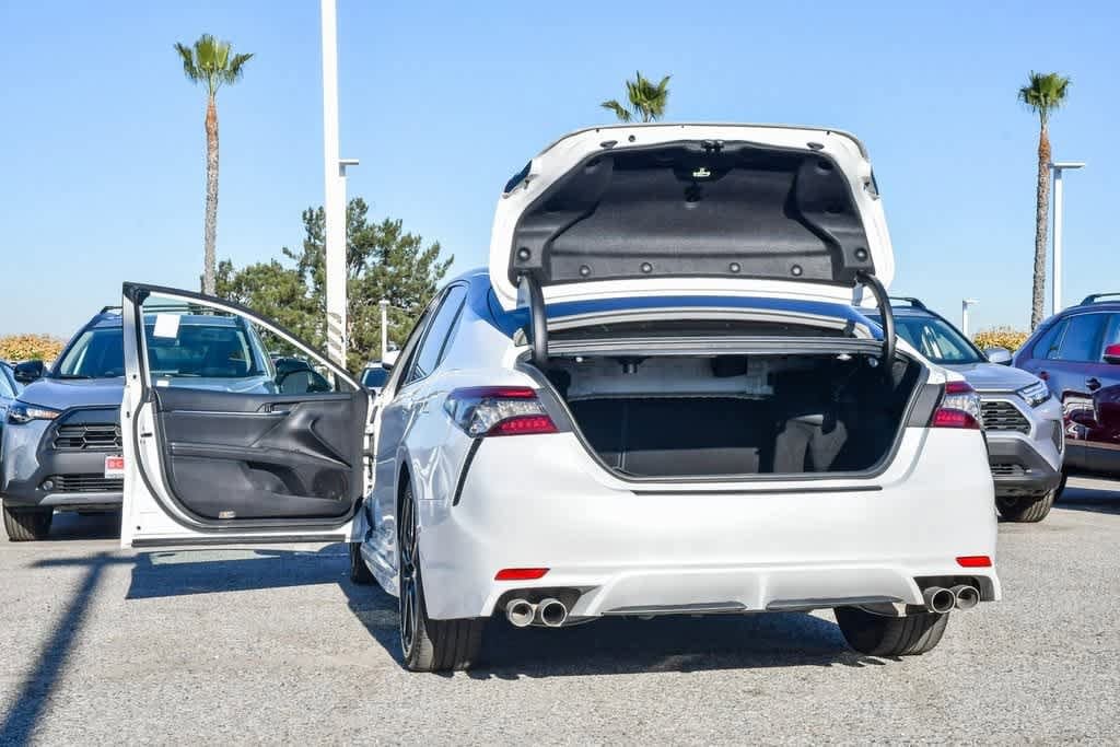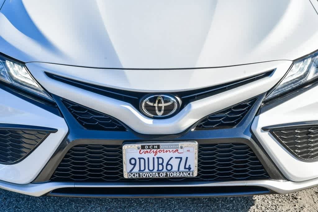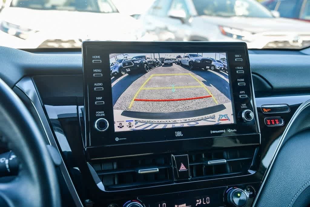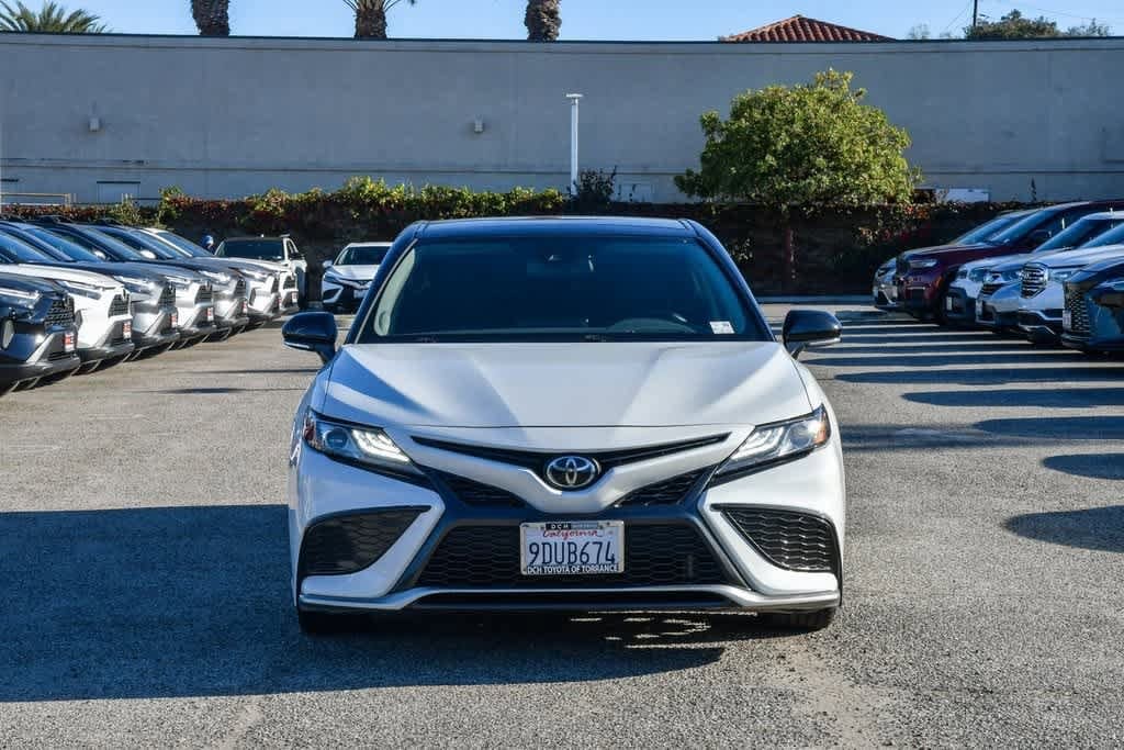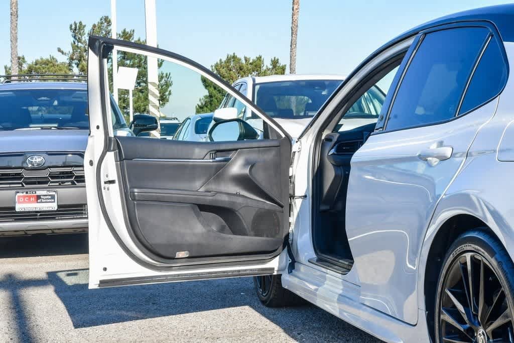 CARFAX One-Owner. Wind Chill Pearl/Midnight Black Metallic 2023 Toyota Camry XSE FWD 8-Speed Automatic 3.5L V6 DOHC 24V 4-Wheel Disc Brakes, Alloy wheels, AM/FM radio: SiriusXM, Apple CarPlay/Android Auto, Automatic temperature control, Brake assist, Bumpers: body-color, Driver door bin, Driver vanity mirror, Dual front impact airbags, Dual front side impact airbags, Electronic Stability Control, Emergency communication system: Safety Connect (1-year trial), Exterior Parking Camera Rear, Four wheel independent suspension, Front anti-roll bar, Front Bucket Seats, Front Center Armrest, Front dual zone A/C, Front reading lights, Heated door mirrors, Illuminated entry, Knee airbag, Leather steering wheel, Occupant sensing airbag, Overhead airbag, Overhead console, Panic alarm, Passenger door bin, Passenger vanity mirror, Power door mirrors, Power driver seat, Power passenger seat, Radio: Audio Plus w/JBL, Rear anti-roll bar, Rear reading lights, Rear seat center armrest, Rear side impact airbag, Remote keyless entry, Security system, Speed control, Speed-sensing steering, Split folding rear seat, Spoiler, Sport SofTex Seat Trim w/Fabric Inserts, Steering wheel mounted audio controls, Telescoping steering wheel, Tilt steering wheel, Turn signal indicator mirrors, Wheels: 8.5J x 19 Alloy.